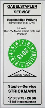 Wir bieten Ihnen den Service für die in BGV D 27 §37 vorgeschriebene jährliche UVV-Prüfung, oder die halbjährliche Abgasuntersuchung (BGV D 34/ bisherige VBG 21 und TRGS 554) für Diesel- und Treibgasstapler an (weitere Informationen erhalten Sie bei der EVAG Deutschland).